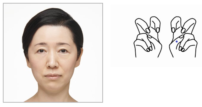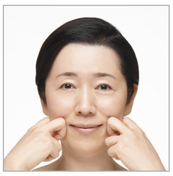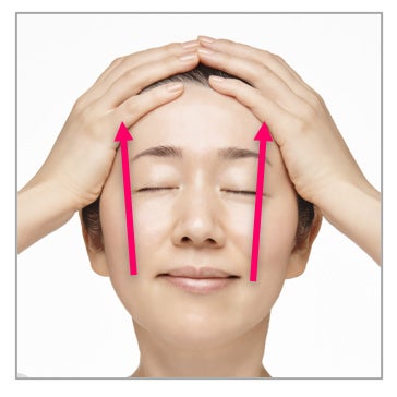 (3) 口もとから目もと、額までグーっと伸ばすように引き上げ、5秒ほどそのままキープします。