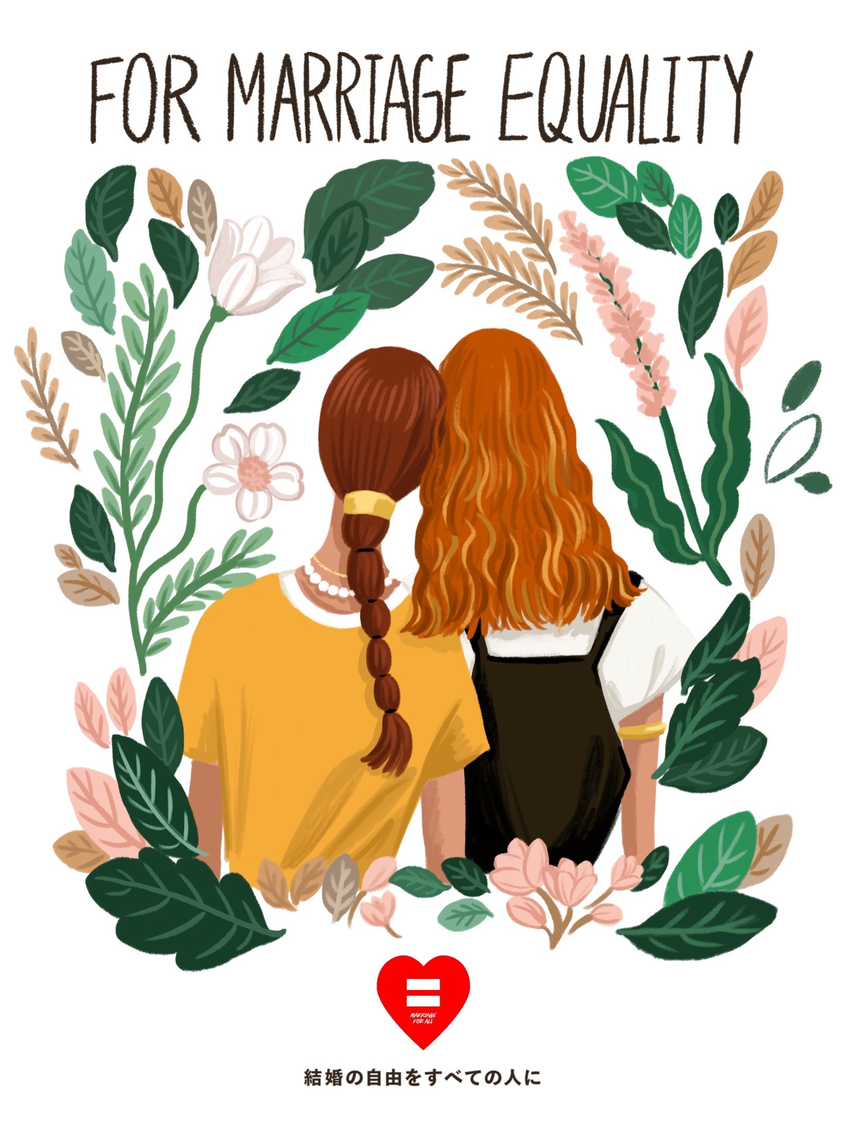 互いを想い合う2人が、当たり前に一緒にいられる、そんな未来を願ってこの絵を制作しました。カップルを優しく包み込むような空気感を作りたく、穏やかな色使いの植物を散りばめています。