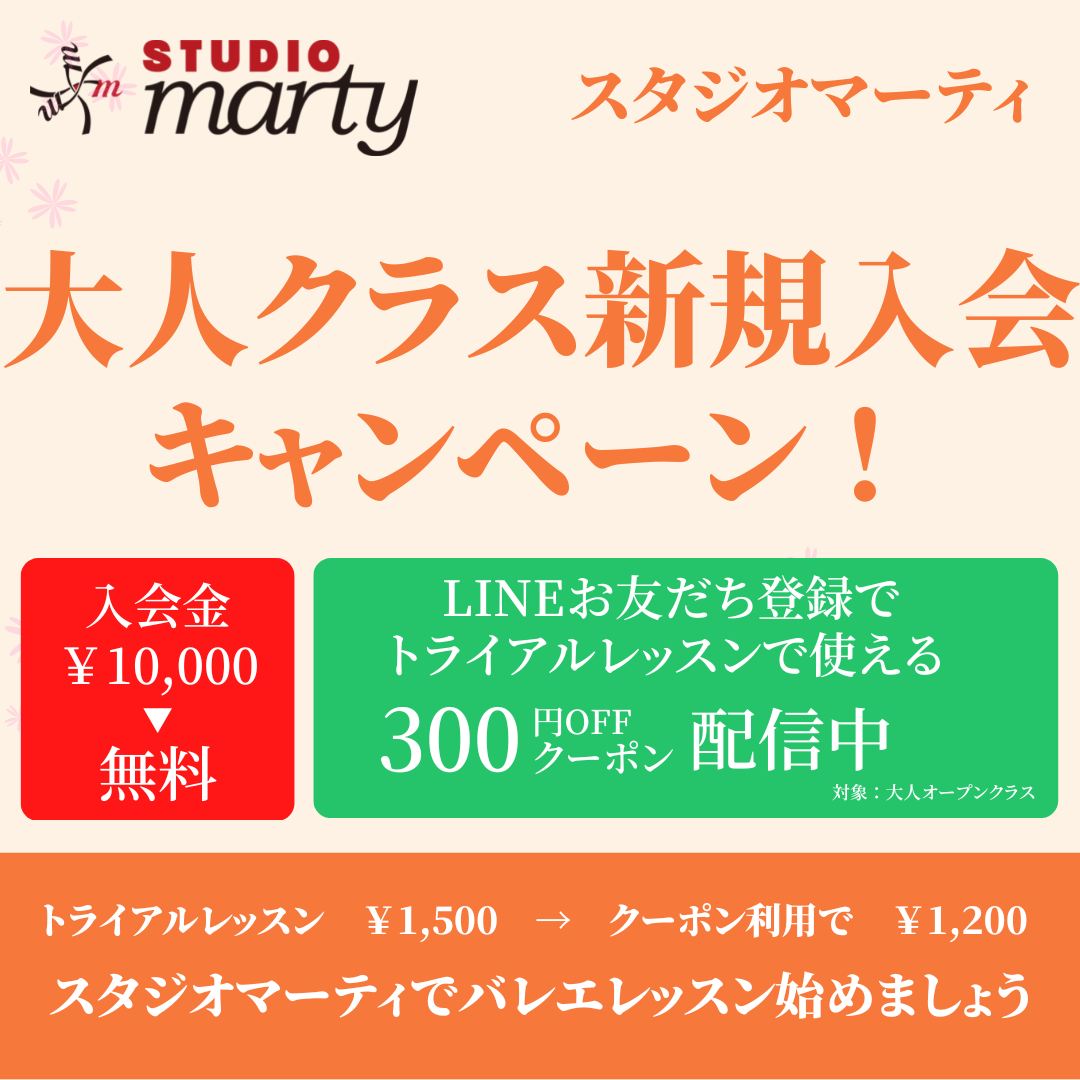 ただいま大人の新規入会キャンペーン実施中!入会金10,000円が今なら無料で入会できます。さらにLINEのお友達登録でトライアル(体験)レッスンで使える300円クーポン配信中!