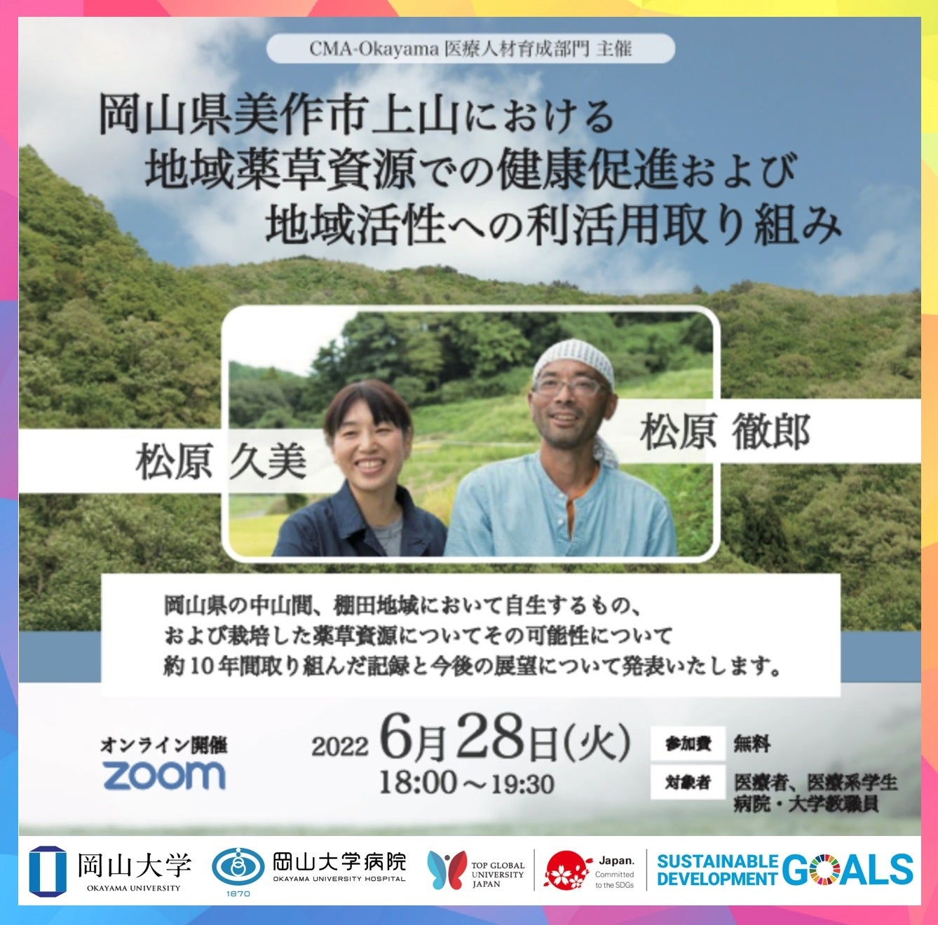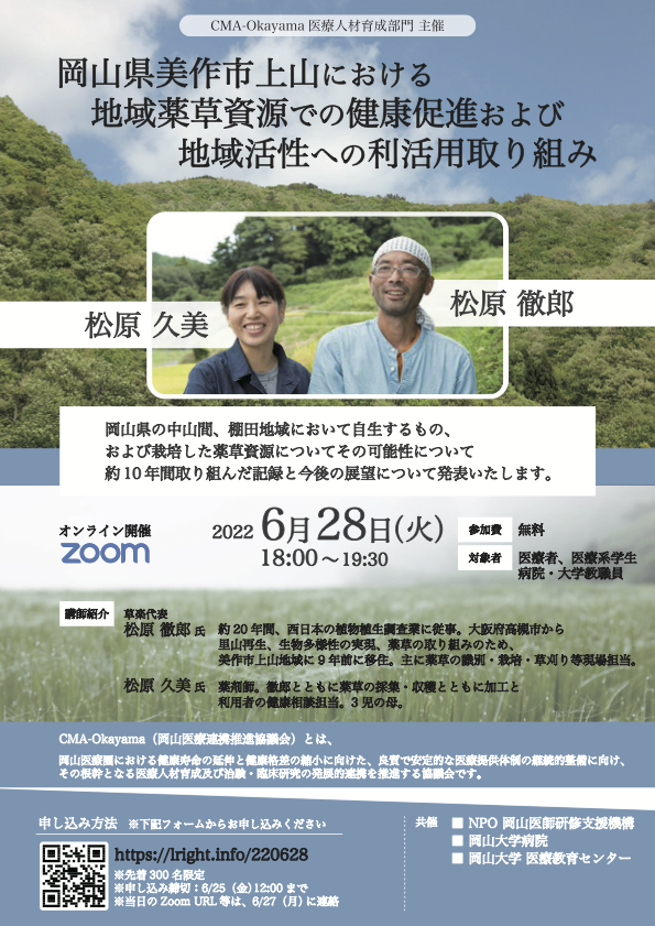 国立大学法人岡山大学(本部:岡山市北区、学長:槇野博史)の岡山大学病院と大学院医歯薬学総合研究科医学教育センターは、CMA-Okayama(岡山医療連携推進協議会)とともに下記の特別セミナー「岡山県美作市上山における地域薬草資源での健康促進及び地域活性への利活用取り組み」を2022年6月28日(火)にオンラインで開催します。