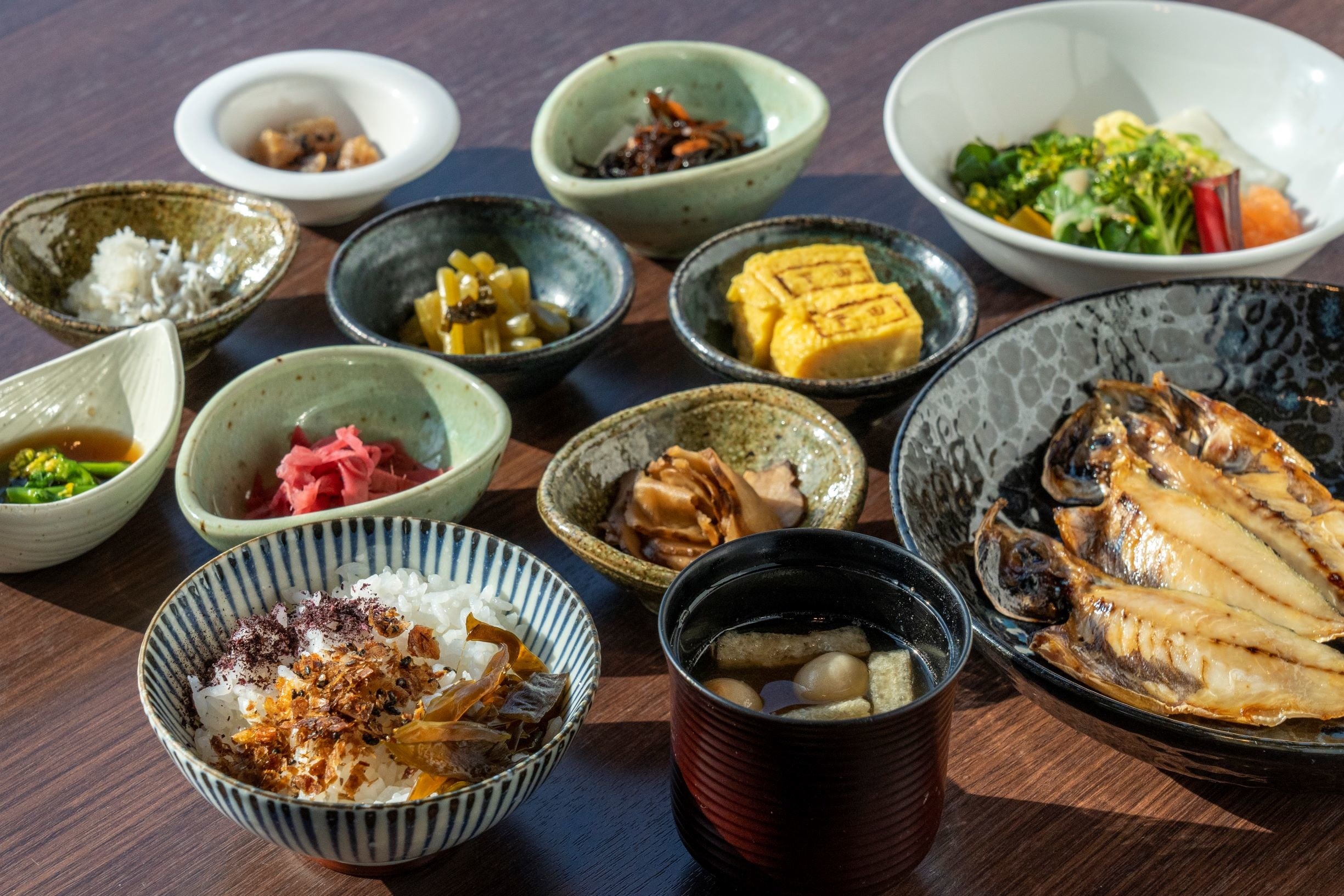 ヨガの後にはホテルレストランにて、南伊豆の新鮮な野菜や果実、お米、下田名産の干物、伊豆や静岡県各地の農産加工品など、「食」でも伊豆の旅を楽しめる「伊豆の朝ごはん」を和洋ブッフェにて提供します。