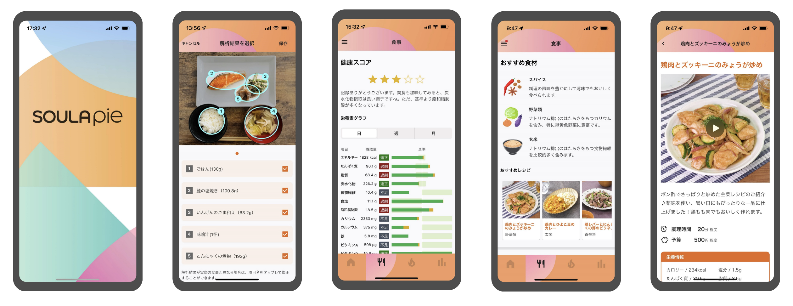 『SOULA pie』は、食事や運動の記録から一人ひとりに合わせた健康のためのレシピを提案できるサービスです。アプリ内で日々の食事の写真を撮るだけで、画像解析によってその時に摂取した栄養素の抽出が可能となっています。