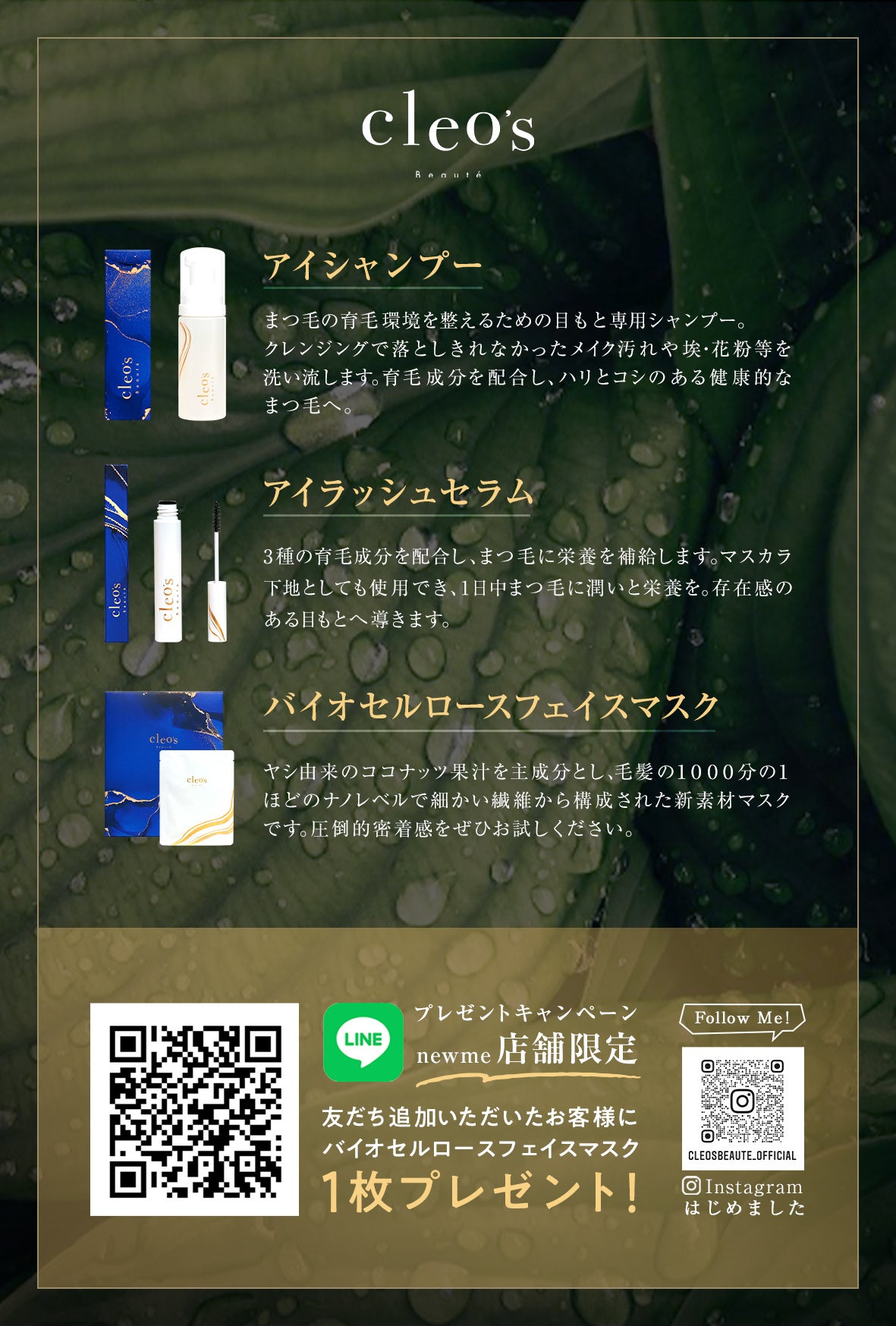 今回のnewmeでは、バイオセルロースフェイスマスク、アイラッシュセラム、アイシャンプーの3商品を販売します。