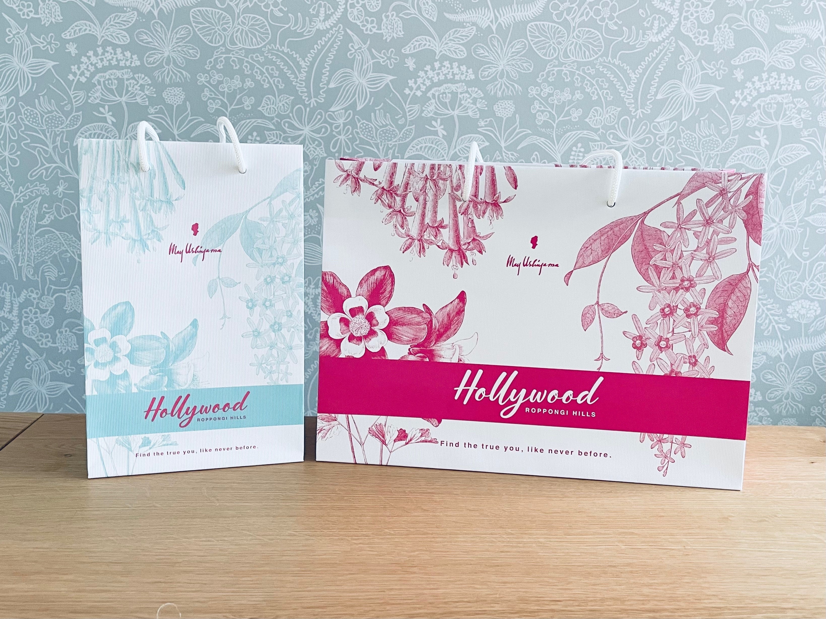 以前はラミネート加工や、持ち手がナイロンのリボンのような紙以外の材料が入っていました。今回、ハリウッドが強く押し進めるSDGs活動の一環として、本体も持ち手も全て紙で製作し100%リサイクルを実現するデザインになっています。元となる紙も再生紙を活用し、またより薄い紙にすることで資源削減を実現するとともに、縦ラインのエンボス加工をつけることで、薄くても強度のあるデザインの紙袋を実現しました。また、インクはベジタブルオイルインクにこだわりました。