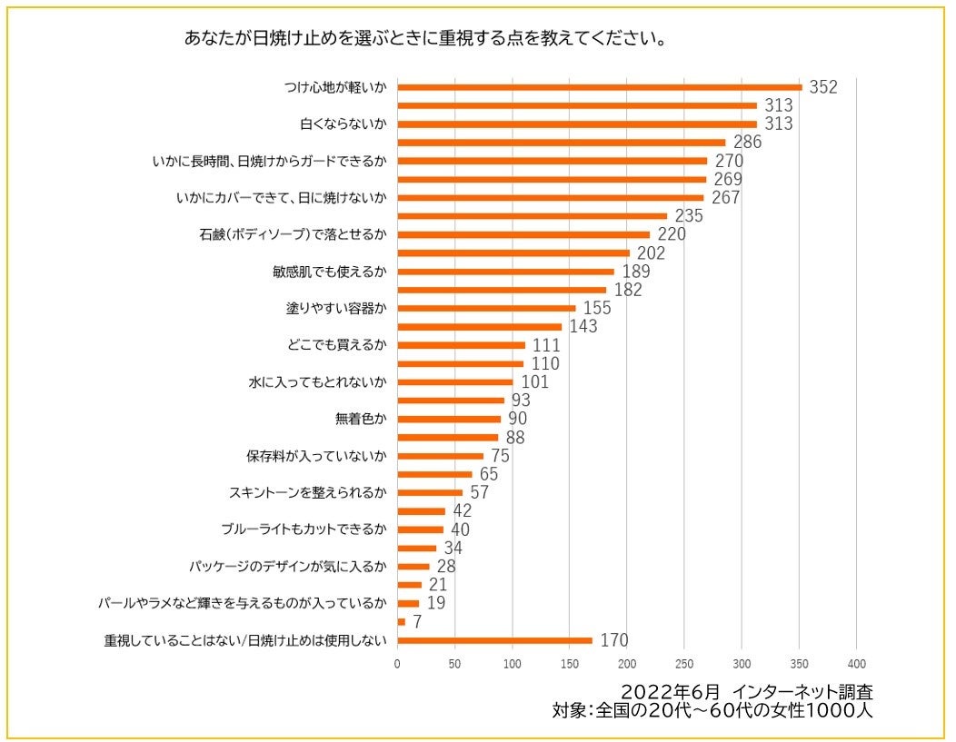 美容・健康コンテンツの制作会社であるマコトプランニングが2022年6月に実際した調査結果によると、日焼け止めを選ぶ際に重視する点のトップ3は「付け心地が軽いか」(352人/1000人中)、「価格が安いか」(313人)、「白くならないか」(313人)、「汗でもとれないか・崩れないか」(286人)、「いかに長時間、日焼けからガードできるか」(270人)の順に。ベーシックな紫外線予防のための機能や価格を気にする人が多い一方、「つけている間にスキンケアができるか」(88人)、「スキントーンを整えられるか」(57人)、「ブルーライトもカットできるか」(40人)、「パールやラメなど輝きを与えるものが入っているか」(19人)と、近年搭載され始めている進化系の機能に留意して選んでいる人はそれぞれ全体の10%未満。