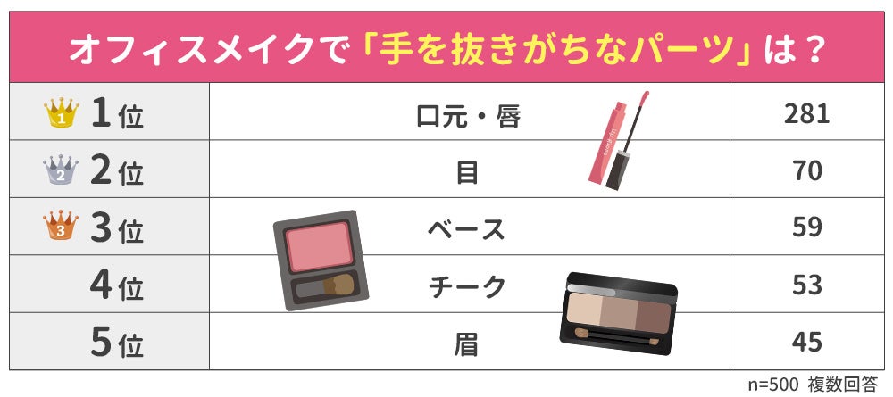 働く女性500人に「オフィスメイクで手を抜きがちなパーツ」を聞いたところ、1位は「口元・唇(281人)」でした。