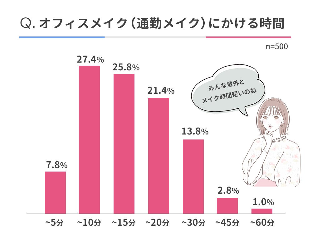 働く女性500人に「オフィスメイク(通勤メイク)にかける時間」を聞いたところ、「5~10分」と答えた人が最も多くなりました。