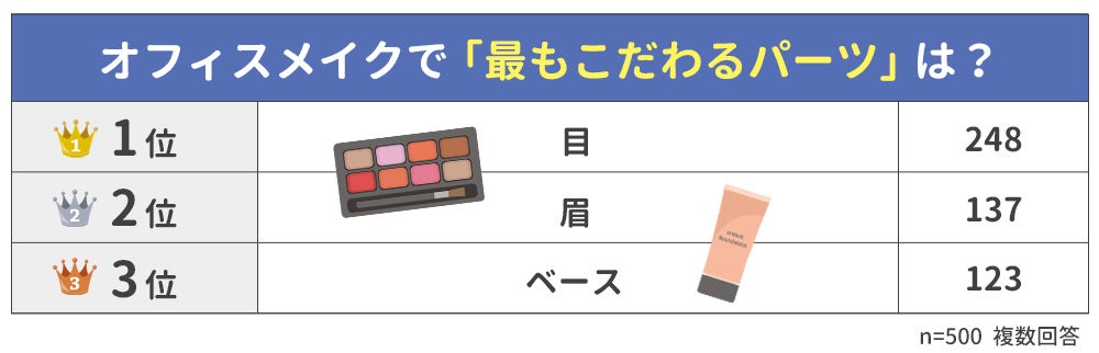 働く女性500人に「オフィスメイクで最もこだわるパーツ」を聞いたところ、1位は「目(248人)」でした。