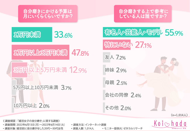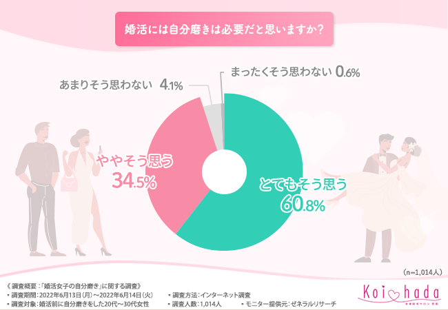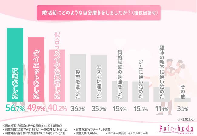 そこで今回、脱毛サロン「恋肌」(https://www.koi-hada.jp/lplj_lv/lp03/?refmedia=178)は、婚活前に自分磨きをした20代〜30代女性を対象に、「婚活女子の自分磨き」に関する調査を実施しました。