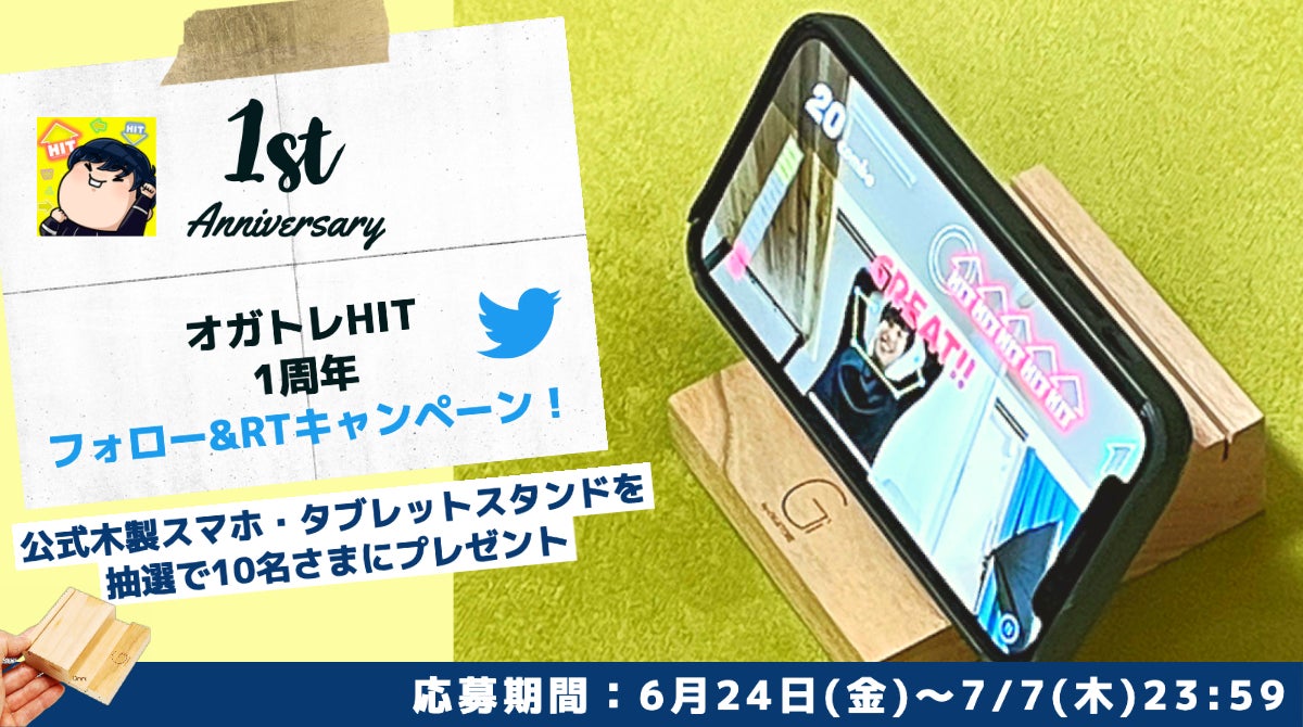 (株)OGATOREが企画開発・運営を行う『オガトレHIT』が、2022年6月24日で1周年を迎えたことを記念し、Twitterプレゼントキャンペーンを実施します。また、同日アプリをアップデートし、最新曲を追加したことをお知らせいたします。