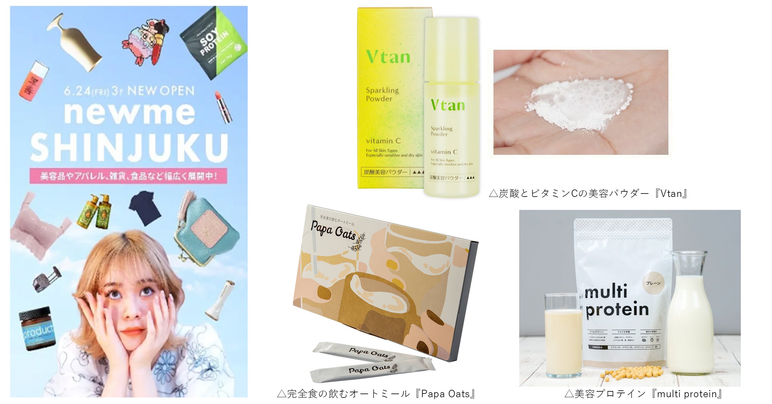 株式会社レッドビジョン(本社:東京都新宿区、代表取締役:河 東龍、https://redvision.jp/ )は、スキンケア商品である炭酸とビタミンCの美容パウダー『Vtan(ビタン)』、インナーケア商品である手軽に1日分の栄養がとれる完全食の飲むオートミール『Papa Oats(パパオーツ)』と髪や肌に嬉しい成分も摂れるシェイカー不要の美容プロテイン『multi protein(マルチプロテイン)』の3ブランドを、2022年6月24日(金)にオープンする体験型セレクトショップ「newme(ニューミー)」新宿マルイ店にて販売を開始します。