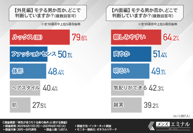 今回の調査で、モテ男の判断基準は外見だけでなく内面にもあることが判明しました。
