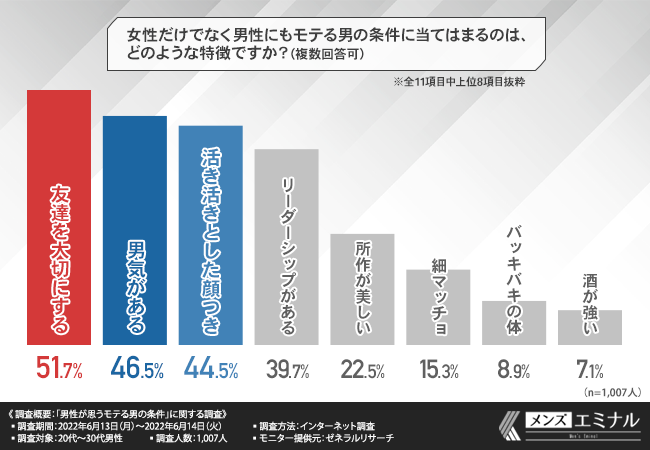そこで、「女性だけでなく男性にもモテる男の条件に当てはまるのは、どのような特徴ですか?(複数回答可)」と質問したところ、『友達を大切にする(51.7%)』と回答した方が最も多く、次いで『男気がある(46.5%)』『活き活きとした顔つき(44.5%)』と続きました。