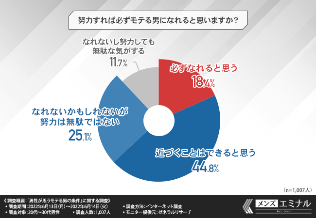そこで、「努力すれば必ずモテる男になれると思いますか?」と質問したところ、6割以上の方が『必ずなれると思う(18.4%)』『近づくことはできると思う(44.8%)』と回答しました。