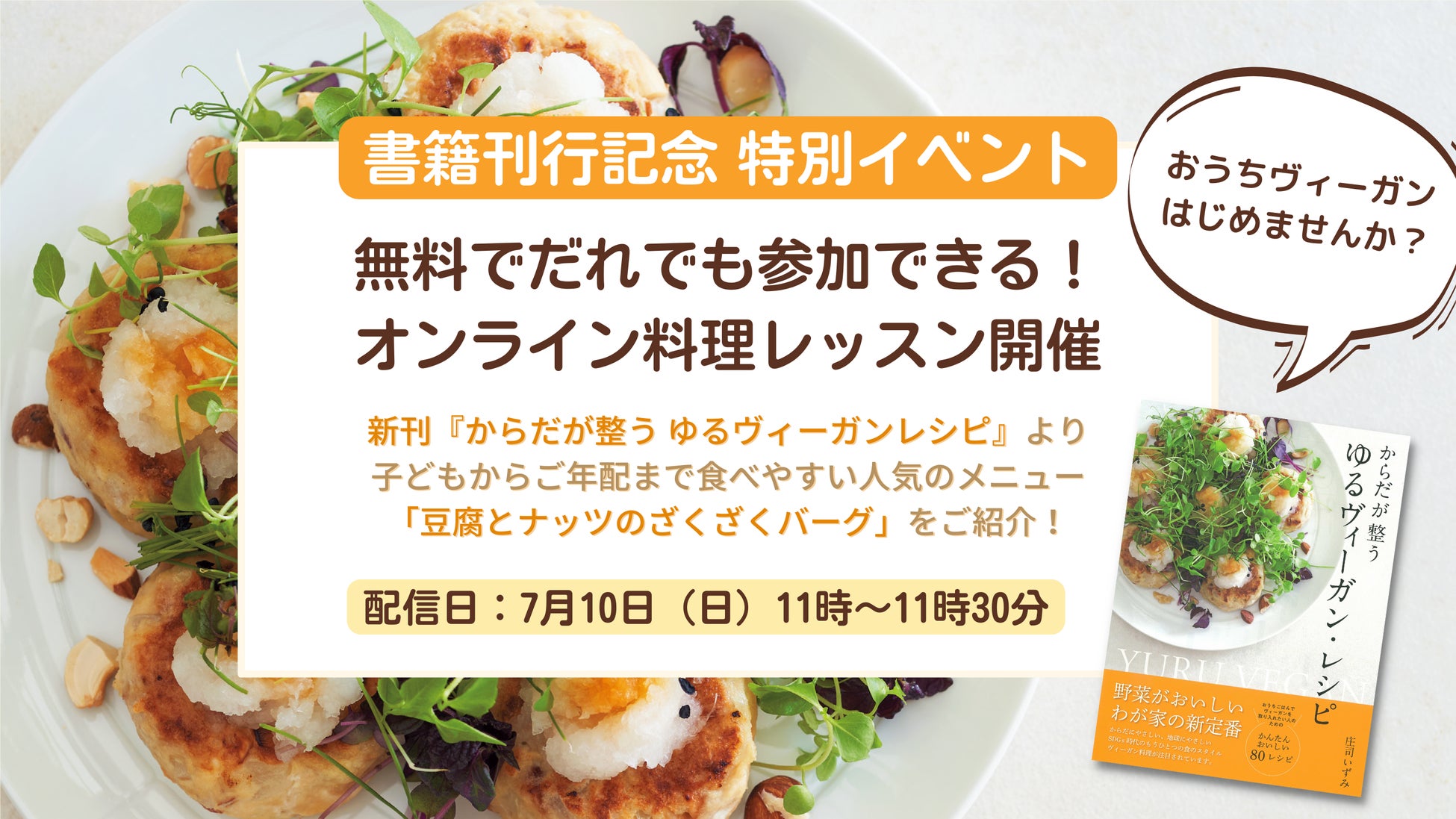 世界文化社は、書籍『からだが整う ゆるヴィーガンレシピ』刊行を記念して、著者・庄司いずみさんのオンラインレッスンチャンネルにて、どなたでもご参加いただける無料の「ヴィーガン料理」オンラインレッスンを7月10日(日)11時~11時30分に開催します。ぜひこの機会にご参加ください。