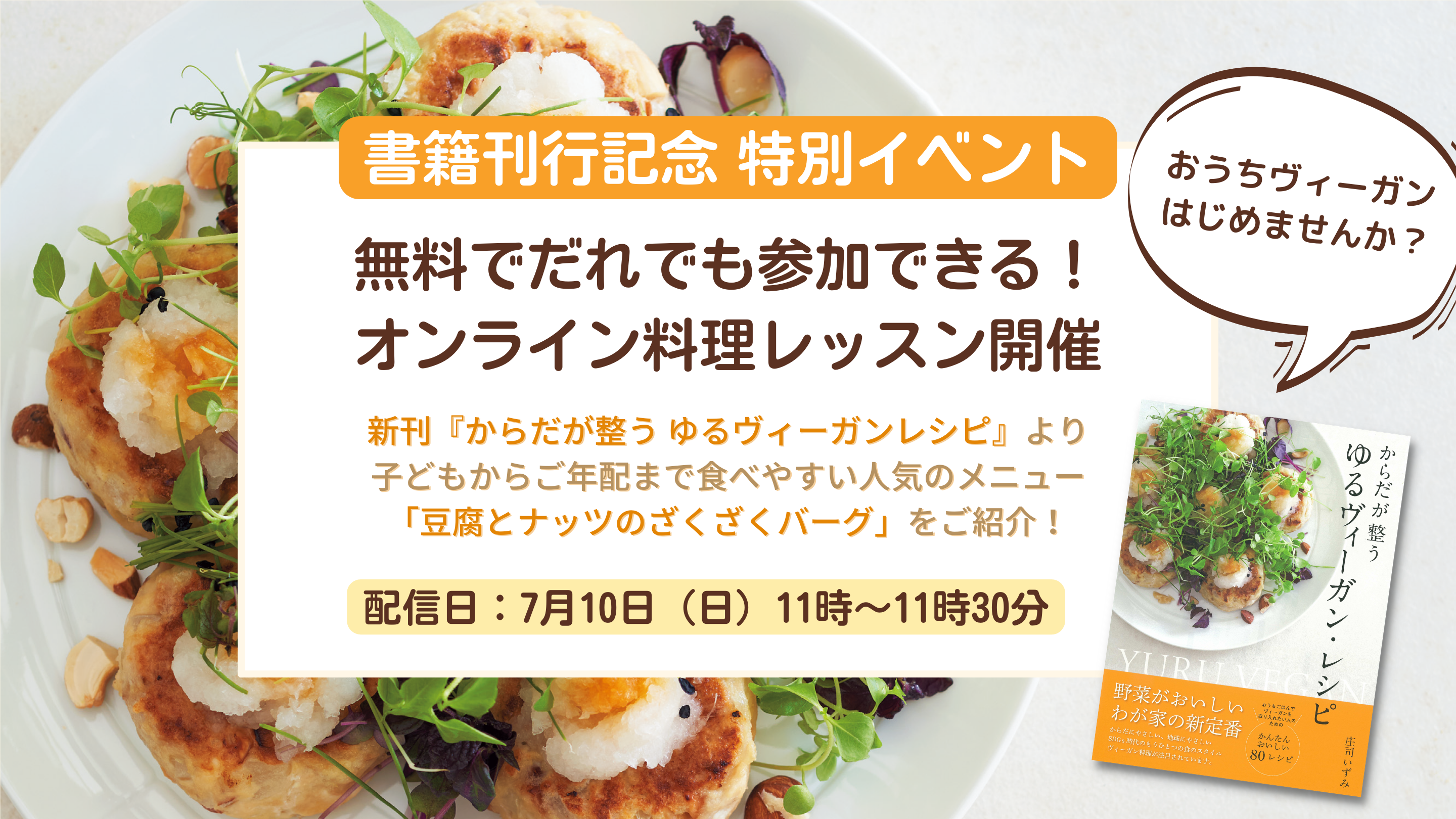 世界文化社は、書籍『からだが整う ゆるヴィーガンレシピ』刊行を記念して、著者・庄司いずみさんのオンラインレッスンチャンネルにて、どなたでもご参加いただける無料の「ヴィーガン料理」オンラインレッスンを7月10日(日)11時~11時30分に開催します。ぜひこの機会にご参加ください。
