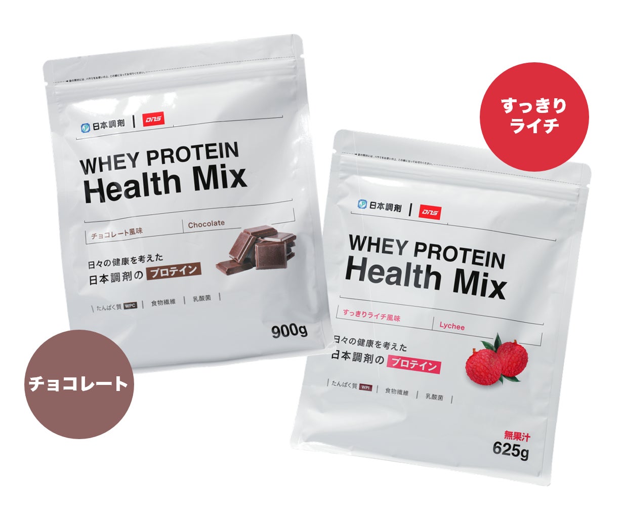 「WHEY PROTEIN Health Mix」は、牛乳から精製したホエイプロテインに乳酸菌(ラクリスTM)と食物繊維(イヌリン)をプラスした、体づくりと健康維持の両方をサポートする独自の配合が特長のプロテインサプリメントです。国内のスポーツ流通シェアNo.1を誇るスポーツサプリメントブランド・DNSと日本調剤の共同開発商品で、好みや気分に合わせて選べるよう、「チョコレート風味」と「すっきりライチ風味」の2種をご用意しました。