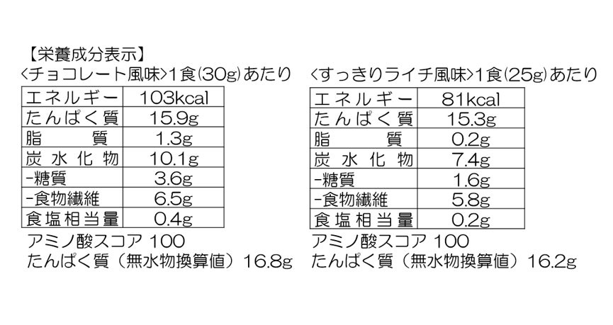 ※チョコレート風味:1食30gあたりたんぱく質15.9g/すっきりライチ風味:1食25gあたりたんぱく質15.3g
