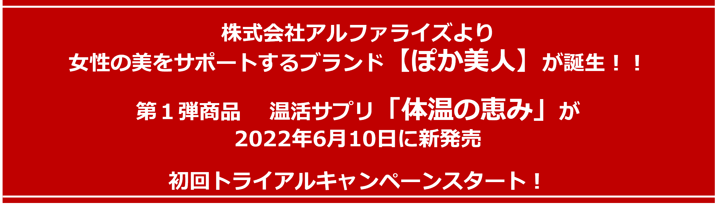 株式会社アルファライズは女性の美をサポートする商品開発に取り組み、今回 新ブランド「ぽか美人」 が誕生しました。第1弾商品として温活サプリ「体温の恵み」を2022年6月10日に新発売いたしました。