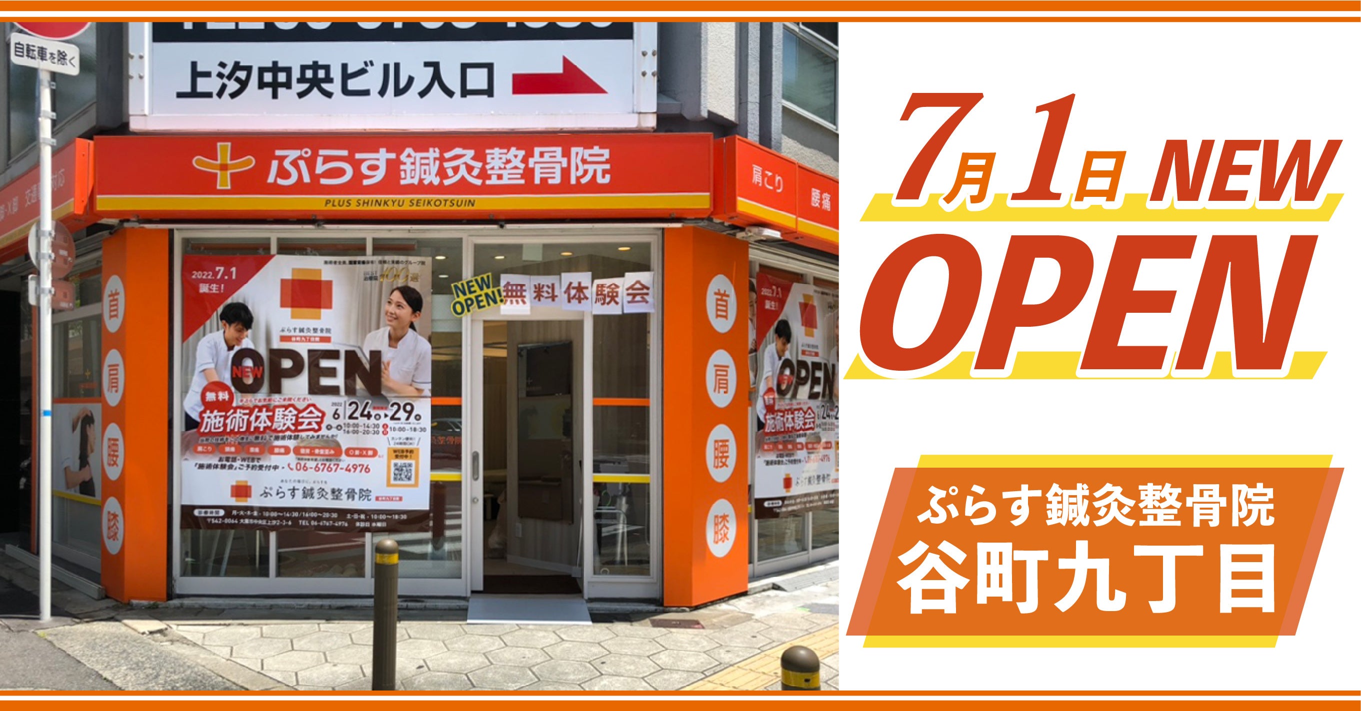 株式会社SYNERGYJAPAN(東京本社:東京都渋谷区、代表取締役社長:高階耕治)が運営するぷらす鍼灸整骨院グループは、2022年7月1日(金)に谷町九丁目駅前に新店舗「ぷらす鍼灸整骨院 谷町九丁目院」をオープンいたします。