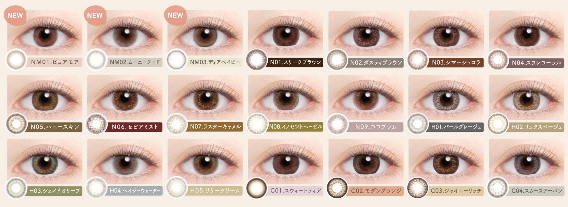 □カラー:NM01-ピュアモア・NM02-ムーニーヌード・NM03-ディアベイビー・N01-スリークブラウン・N02-ダスティブラウン・N03-シマーショコラ・N04-スフレコーラル・N05-ハニースキン・N06-セピアミスト・N07-ラスターキャメル・N08-イノセントヘーゼル・N09-ココプラム・H01-パールグレージュ・H02-リュクスベージュ・H03-シェイドオリーブ・H04-ヘイジーウォーター・H05-リリークリーム・C01-スウィートティア・C02-モダングランジ・C03-シャイニーリッチ・C04-スムースアーバン