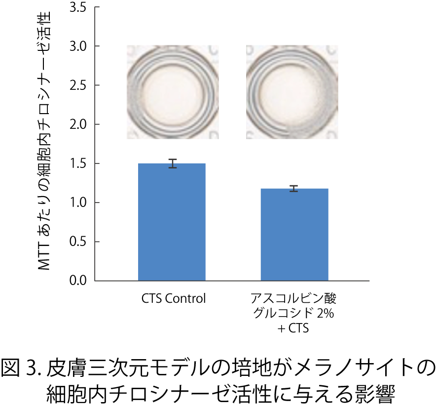 さらに、皮膚3次元モデルの培地をヒトメラノサイトに添加、培養したときの細胞内チロシナーゼ活性に与える影響について評価した結果、細胞内チロシナーゼの活性抑制効果が確認されました。この評価結果について、皮膚3次元モデルを通過してきたアスコルビン酸グルコシドの影響を差し引いても、チロシナーゼ活性抑制効果を示していました(データは示さない)。つまり、アスコルビン酸グルコシドのサイトカイン類の抑制効果が、非常に大きく細胞内チロシナーゼ活性抑制に寄与していることを示唆しました。