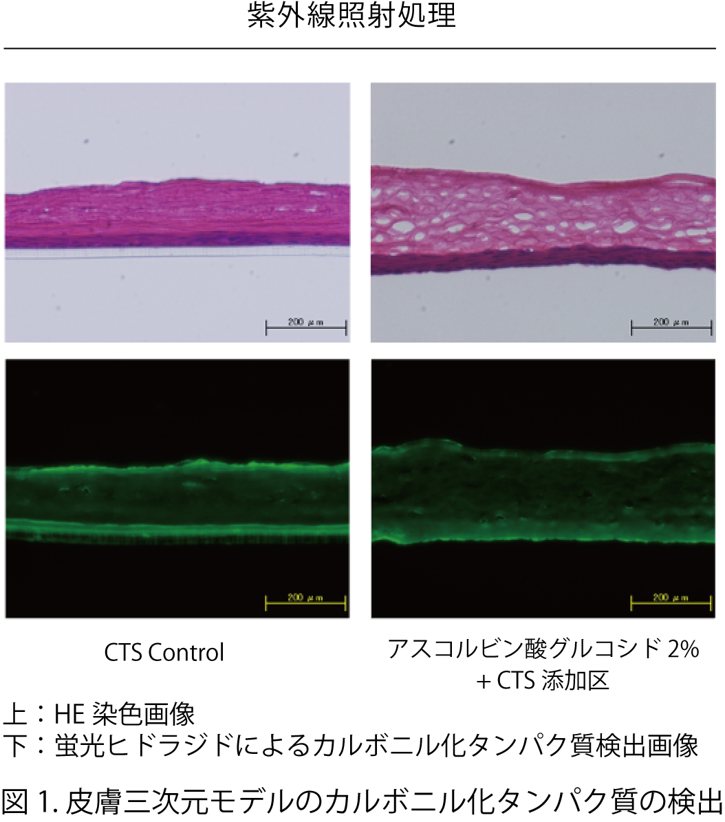 そこで研究チームは「誘導体として」の働きに注目し、アスコルビン酸の形で発揮する有効性とは異なるメカニズムに基づく色素沈着に対する影響について検証を行いました。その結果、紫外線照射した皮膚三次元モデルを用いた試験において、αグルコシダーゼの働きを抑えるカスタノスペルミン(以下CTS)を添加した状態でアスコルビン酸グルコシドを添加した場合に、角層タンパク質のカルボニル化を抑制していることを見出しました(図1)。アスコルビン酸グルコシドがタンパク質のカルボニル化を抑制するとういうことは、BSA等を用いたin vitro系ではデータが知られていましたが、3次元皮膚モデルを用いた、より正常な皮膚組織に近い実験系では、初めての知見でした。