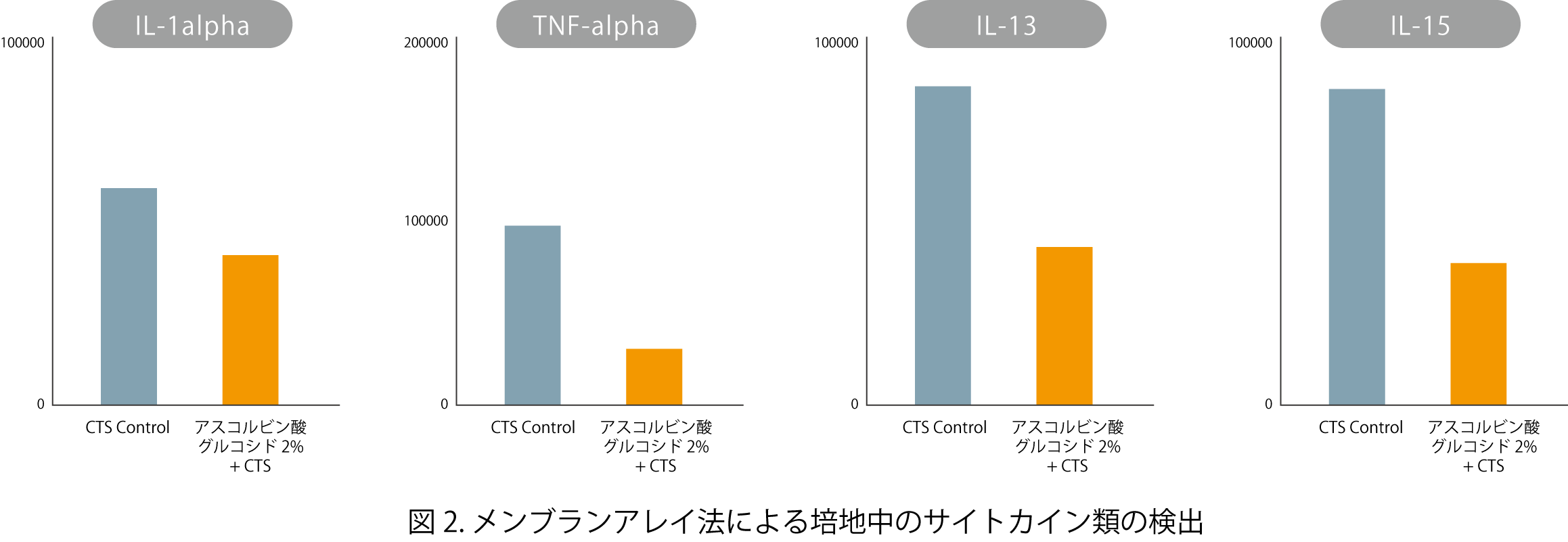 また、カルボニル化タンパク質が検出されるということは、組織内に酸化ダメージが発生しているということになることから、その結果産生される炎症性サイトカイン類について、メンブランアレイ法を用いて検出を試みました。その結果、色素細胞のメラニン合成への関与が考えられているIL-1α、TNF-αや、その他免疫系に関わるIL-13、IL-15について、紫外線照射によって亢進したものを、アスコルビン酸グルコシドとCTSを併用した試験区でも、抑制することができました(図2)。