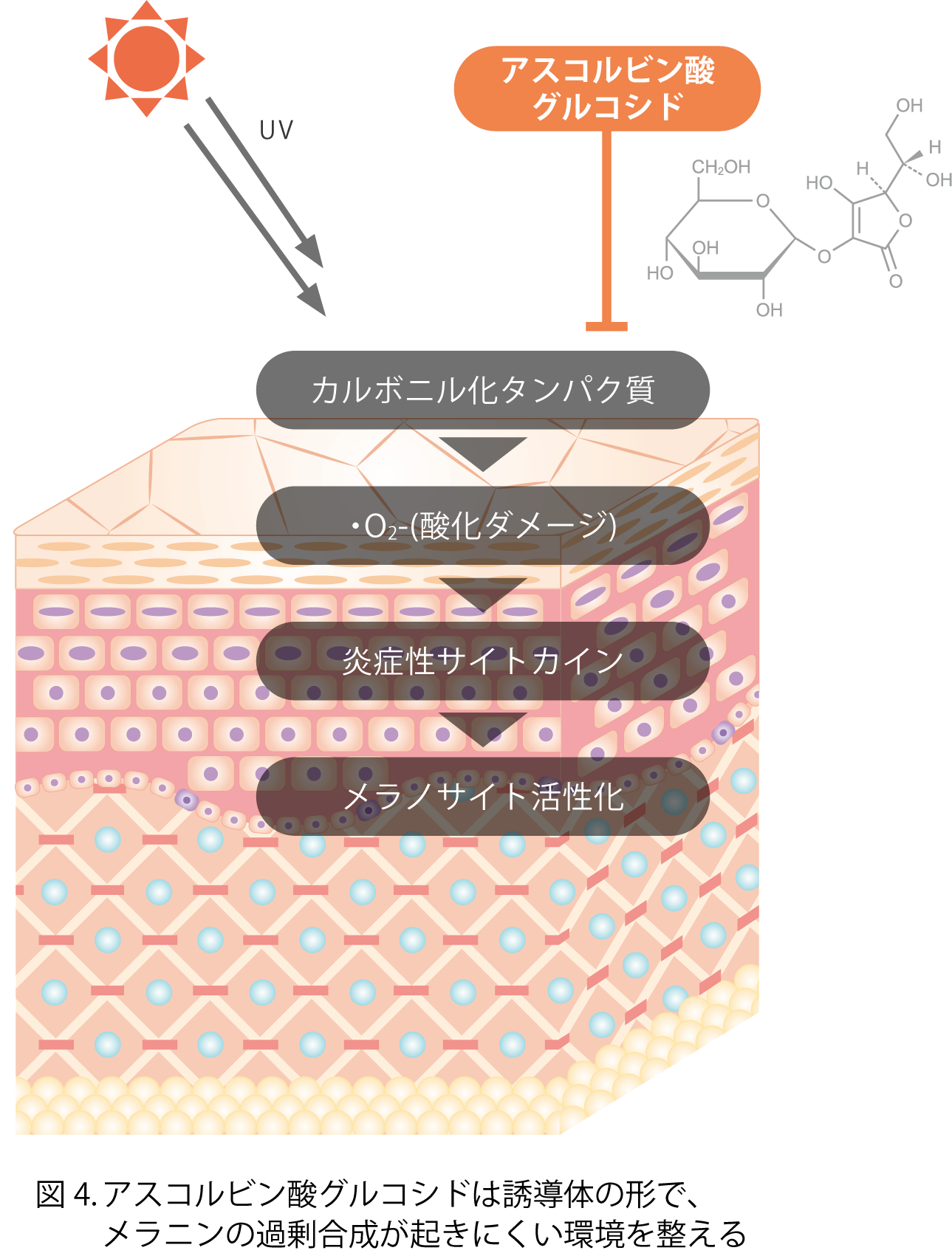 アスコルビン酸グルコシドは、アスコルビン酸に変換される前の誘導体の形でも、角層のカルボニル化を抑制するという効果を持つことが示唆されました。さらには、サイトカイン類の分泌抑制によると考えられる、メラノサイトの細胞内チロシナーゼ活性抑制効果が認められました。これらは、メラノサイトの周辺環境を健全に整えることで、過剰なメラノサイトの生成を抑制するアプローチが可能なことを意味します。ビタミンCがメラノサイトに取り込まれなくとも、誘導体の形のままでブライトニング効果を発揮することを示す、最初の本格的な学術報告となりました。