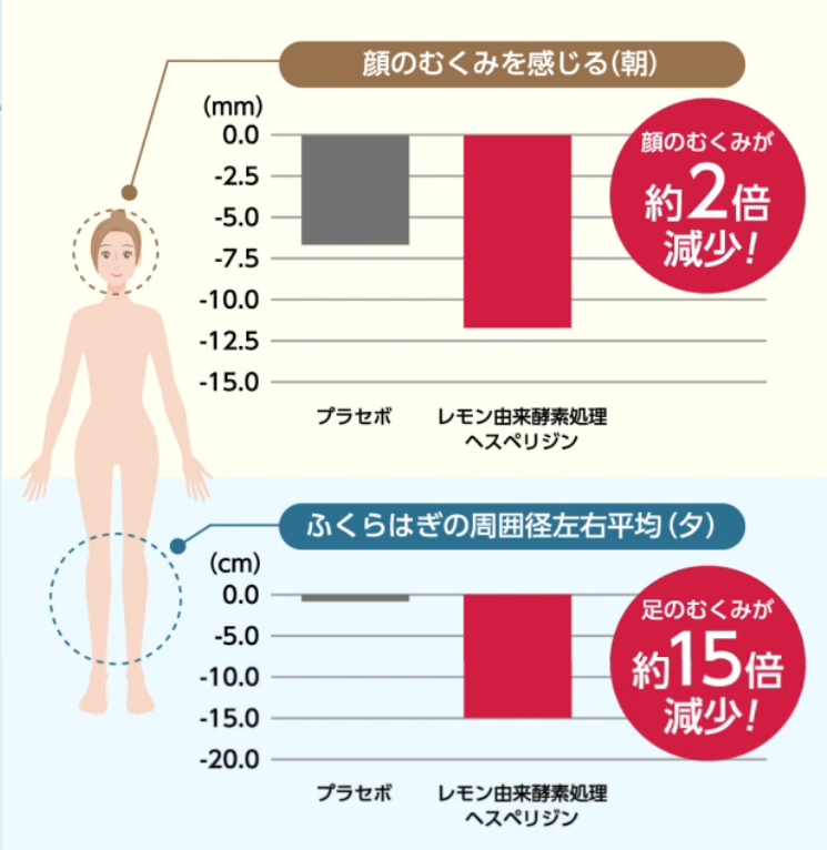 レモン由来のモノグルコシルヘスペリジンは、顔のむくみ感とふくらはぎのむくみを軽減する機能が報告されています。