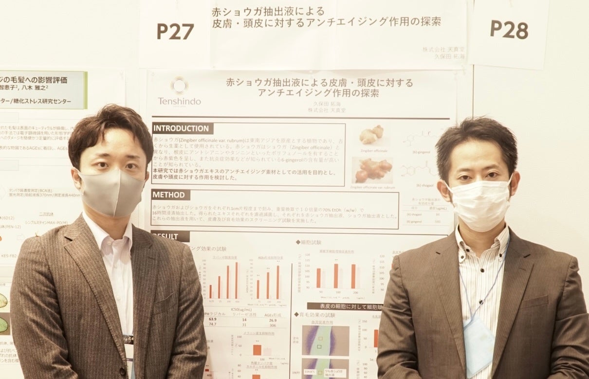 天真堂は「赤ショウガ抽出液による皮膚・頭皮に対するアンチエイジング作用の探索」と題し、下記の内容の発表を行いました。