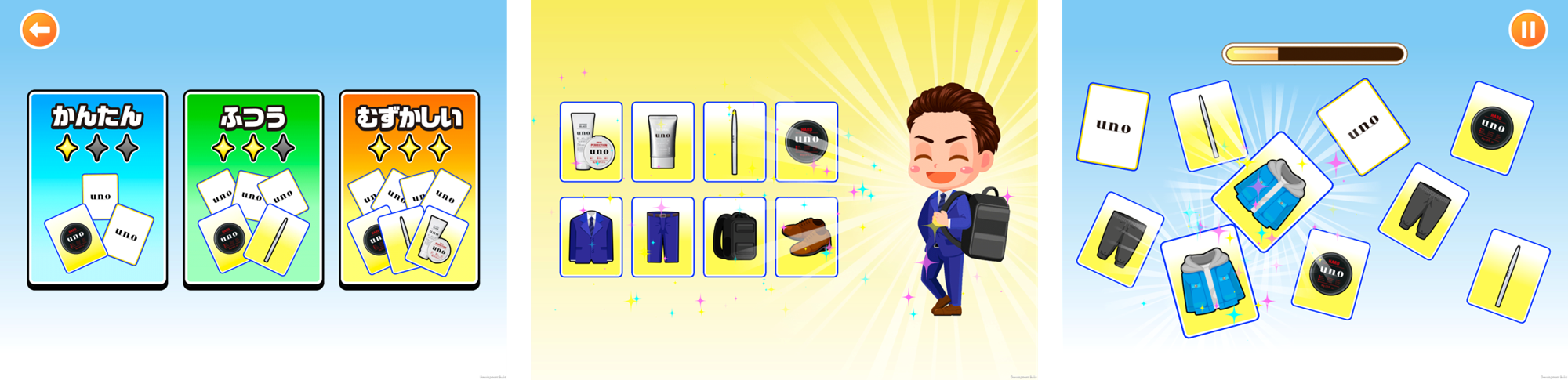 洗顔やスキンケア、スーツなどの“おでかけアイテム”のイラストが描かれている複数のカードを1枚ずつめくり、制限時間内に同じアイテムのペアを見つけて獲得するゲームです。「かんたん」、「ふつう」、「むずかしい」の3つの難易度があります。ゲーム後、獲得したアイテムによってキャラクターのおでかけの装いが変化します。※初回プレイ時は「かんたん」のみ選択可能です。