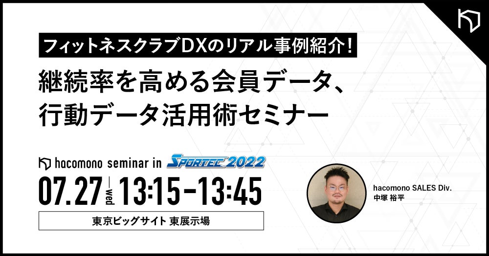 ウェルネス産業向けのオールインワン基幹システム「hacomono」を提供する株式会社hacomono(本社:東京都豊島区、代表取締役:蓮田 健一)は、2022年7月27日(水)からの3日間、東京ビッグサイトにて開催される、日本最大のスポーツ・フィットネス・健康産業総合展「SPORTEC 2022」に出展いたします。