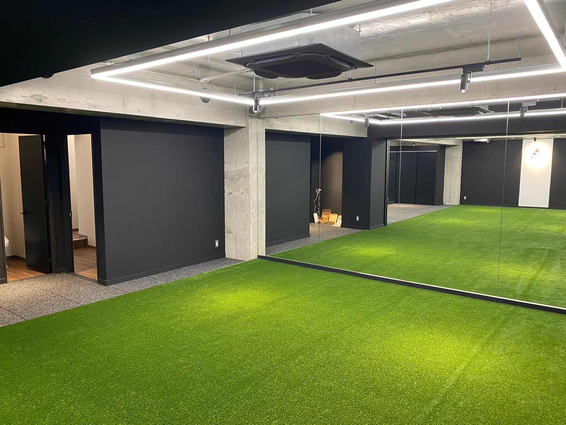 約110平米のトレーニング空間をトレーナーと顧客の1対1の空間としてご利用いただけます。サッカーをイメージしたその空間の床は、Jリーグクラブの練習場と同じ人工芝を敷設し、さらに顧客の身体への負荷を極力減らす様に人工芝の下には最高級のゴムマットが敷かれております。