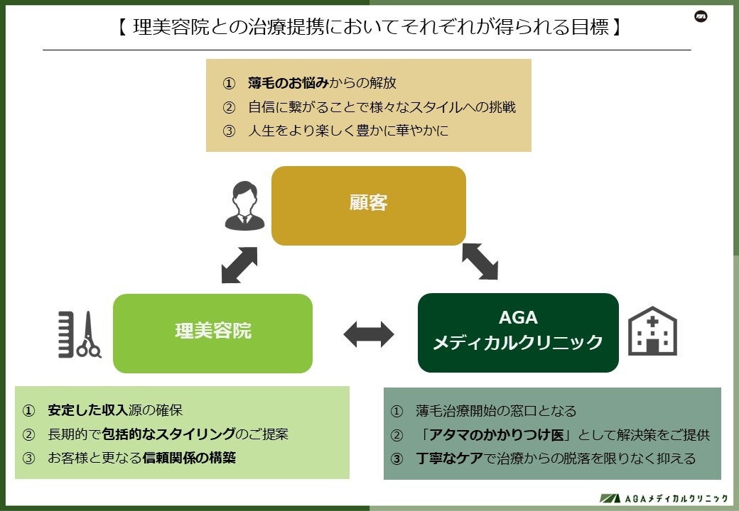例えば、理美容院との提携において「顧客」「理美容院」「AGAメディカルクリニック」それぞれが得られる目標をお示しする(図1)。