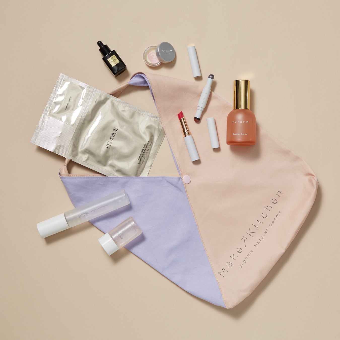 現品5種とトライアルに嬉しいミニサイズ3種の計8点を、 バイカラーデザインの大人可愛いメイクアップキッチンオリジナルデザインエコバッグに入って数量限定で発売いたします。
