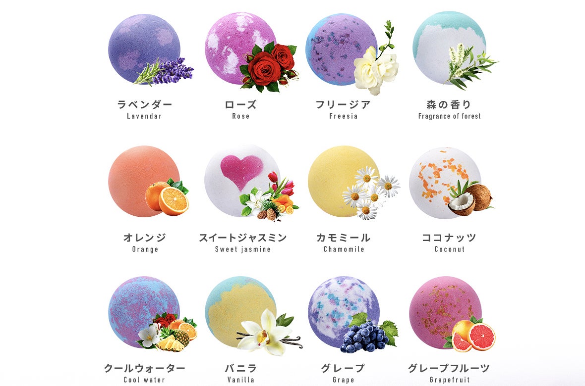 今回のセットには、今までのバスボムシリーズで最も人気のあったフレイバー、フルーツの香りから華やかな薔薇の香りまで、ラベンダー、ローズ、フリージア、森の香り、スイートジャスミン、カモミール、ココナッツ、クールウォーター、バニラ、グレープ、グレープフルーツ、オレンジ 計12種類と、特に人気のある香りを厳選しております。日々変わる体調や その日の気分に合わせてお好きな香りを選んで楽しむことができます。