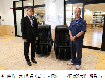 6月28日(火)に太子町役場で行われた贈呈式では、フジ医療器大阪工場の岩根工場長より「太子町への想いを形にすることができた。利用者の方々の心と体の健康づくりに貢献できればと思う。」とし、これに対して、田中祐二町長は「非常にありがたい。フジ医療器は、SDGsの達成や社会課題の解決に熱意を持って取り組んでいる地元企業。引き続き、お互いに協力して様々な取組みを進めていきたい。」と話しました。