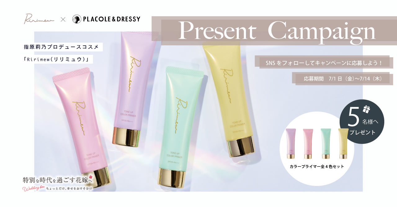 「PLACOLE & DRESSY」ブランドを展開する、冒険社プラコレ(本社:神奈川県鎌倉市、代表取締役CEO:武藤功樹)は、コロナ禍で結婚準備をすすめる花嫁に対して「特別な時代を過ごす花嫁へ」DRESSYが贈る、特別コンテンツ。第20回目となる今回は指原莉乃さんをプロデューサーに迎えたコスメブランドRirimew(リリミュウ)とのコラボ企画を実施、花嫁メイクで是非使って欲しい『花嫁カラープライマー』を5名様にプレゼントすることが決定しました。