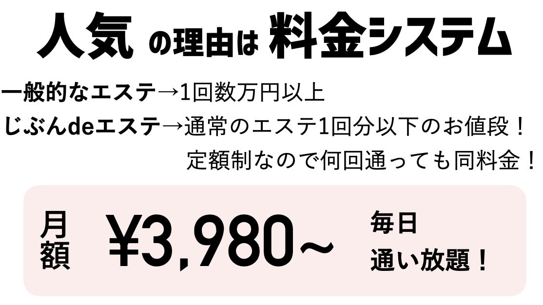 月額3,980円(メンズ店は月額5,980円)~の定額制で全国全店舗通い放題!”痩せたい!けど、エステは高くて通えない…”、”忙しくて一回が長いエステはなかなか行けない”、”行きたい時に 予約が取れない” 、”女性のエステティシャンに身体見られるのは恥ずかしい、、、”などエステに興味はあるけど、 さまざまな理由で通えない男性は多いはず。 『じぶんdeエステ』は、エステの敷居をグッと下げ全ての男性が気軽に、でも本気で自分の美を追求できる新感覚のセルフエステジムです。