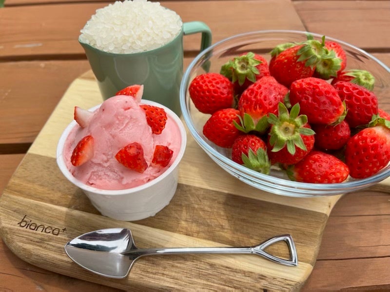 京丹後産コシヒカリを原料にして作るライスミルクと、京丹後産のいちごを使用。植物由来のため低脂質で、お米本来の優しい甘さが感じられるさっぱりとした味わいや、いちごの甘味、果肉のジューシーさが特徴。