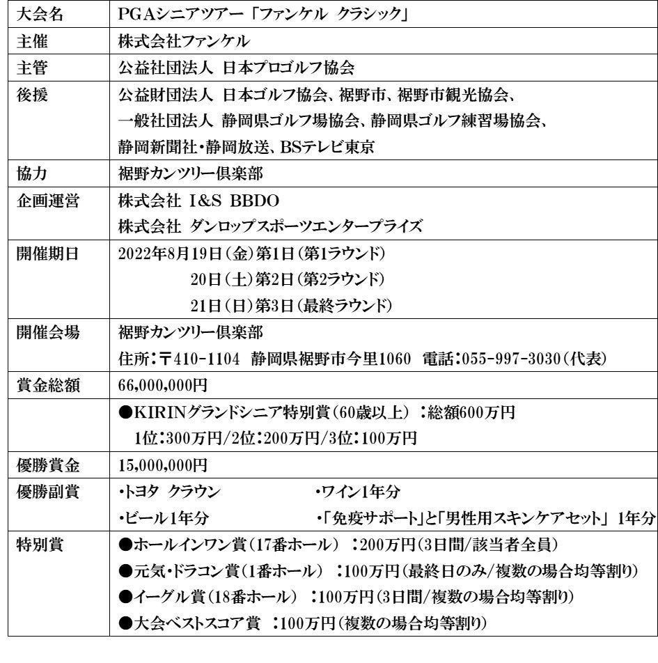 株式会社ファンケルは、2022年8月19日(金)~21日(日)の3日間、公益社団法人「日本プロゴルフ協会」(PGA、所在地:東京都港区、会長:吉村金八)主管競技、PGAシニアツアー「ファンケル クラシック」を静岡県裾野市の裾野カンツリー倶楽部で開催します。