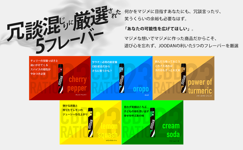 これまでのCBDベイプの開発・処方実績を元に、数万通りの中から、ブランド名に合わせた”冗談混じり”の5フレーバーを厳選しました。