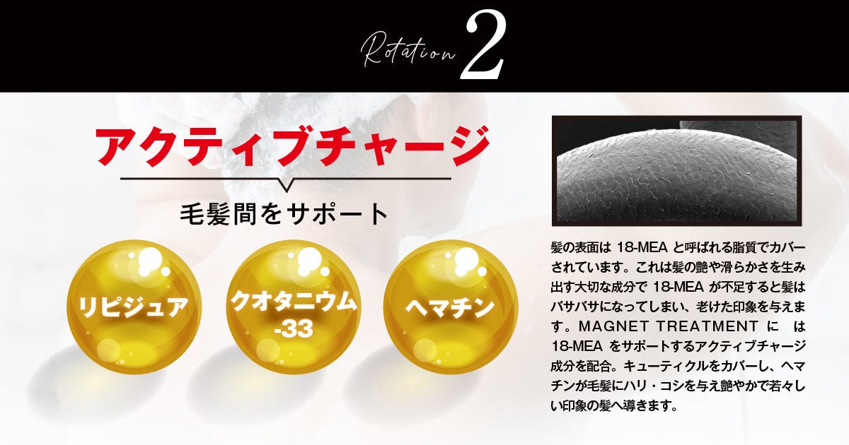 2. アクティブチャージ:アクティブチャージ成分で艶やかでハリコシのある髪に。