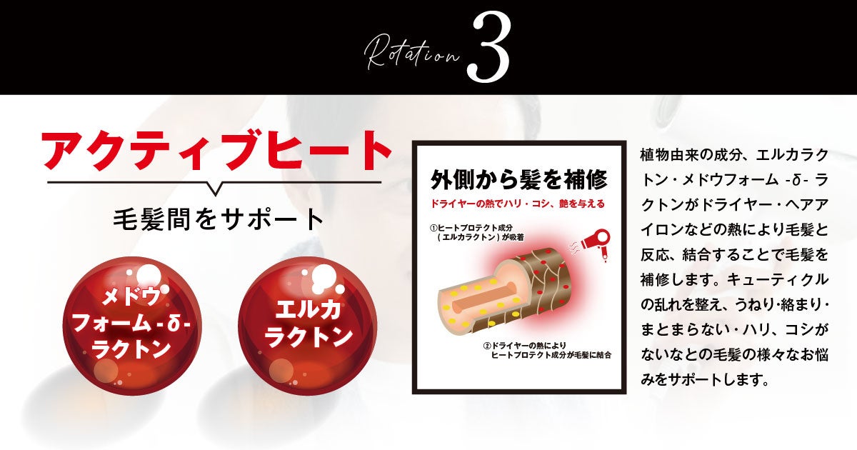 3. アクティブヒート:ドライヤーやヘアアイロンの熱を使って、髪のダメージ補修を助ける成分を配合。