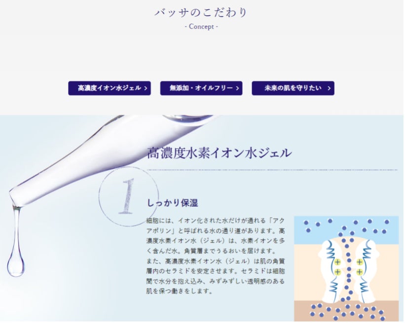 WASSER(バッサ)高濃度水素イオン水ジェル美容液は特許を取得しています。お肌に優しく、しかも確かな手ごたえを感じることができる美容液です。そのカギを握るのは「水の通り道」です。