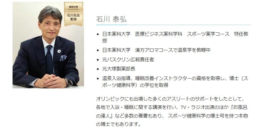 記念すべき初回のコラムでは、多くのメディアにも出演された石川泰弘先生に監修いただき、『ジメジメ気分をスッキリ!夏の入浴・快眠法』と題して、「季節や目的にあった入浴方法」と「睡眠環境の作り方」などをご紹介しています。石川先生監修のコラムは今後5回にわたって掲載を予定しておりますので、更新を楽しみにお待ちください。
