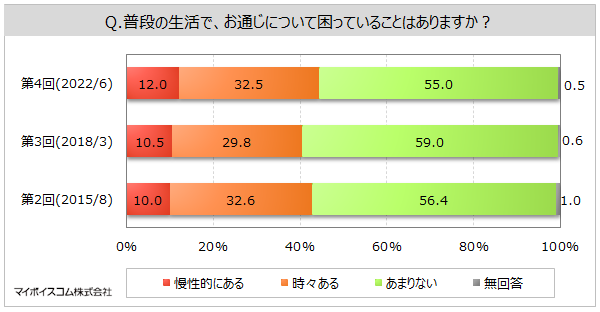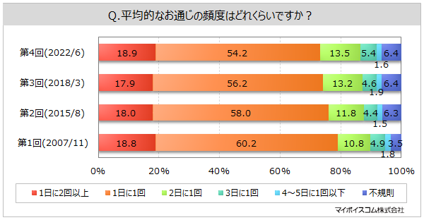 マイボイスコム株式会社(東京都千代田区、代表取締役社長:高井和久)は、4回目となる『お通じ』に関するインターネット調査を2022年6月1日~5日に実施し、10,197件の回答を集めました。調査結果をお知らせします。