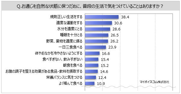 お通じを自然な状態に保つために気をつけていることは(複数回答)、「規則正しい生活をする」が38.4%、「適度な運動をする」が30.6%、「水分を適度にとる」「睡眠を十分とる」が各3割弱です。「野菜、果物を適度に摂る」「水分を適度にとる」は女性や高年代層で比率が高くなっています。男性10~30代では「特に何もしていない」が各4割強となっています。