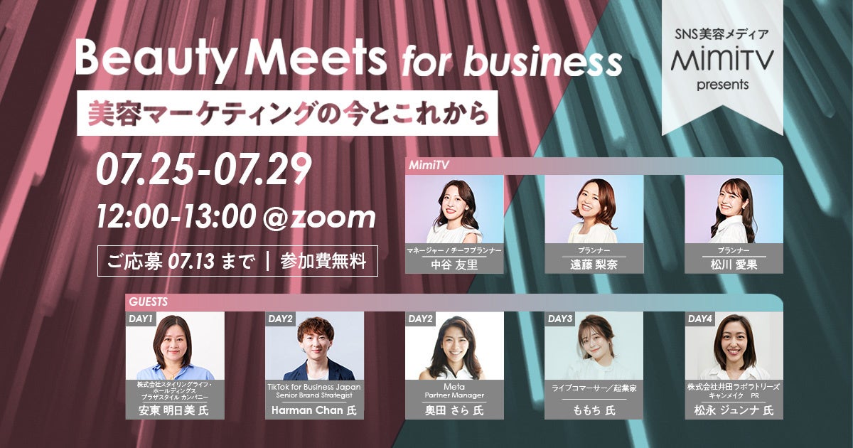 MimiTVは、過去3回にわたりブランド担当者やインフルエンサー、メイクアップアーティストなど、美容の最前線で活躍する方々をお迎えしてオンラインビューティーイベント「Beauty Meets」を開催してまいりました。そしてこの度、2022年5月25日のリブランディングによる新しいコンセプト「美容でときめく世界を、一緒に」をテーマに、「Beauty Meets for business~美容マーケティングの今とこれから~」を開催します。